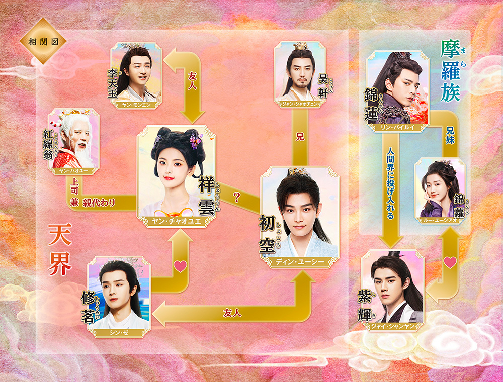 主演は、人気俳優ディン・ユーシーと女優ヤン・チャオユエ。天界のおてんばな仙女・祥雲(ヤン・チャオユエ)と戦神・初空(ディン・ユーシー)の間で繰り広げられる、七世にも及ぶロマンス劇をキャッチーでライトな雰囲気で演じきった。戦神役のディン・ユーシーは、2020年の主演ドラマ「花の都に虎われて~The Romance of Tiger and Rose~」の病弱で腹黒なツンデレ若様役で一躍ブレーク。ヒロインのヤン・チャオユエは「将夜 冥王の子」で天女役を務め、その美しさに圧倒される人も多かった。その後「千紫万華~重紫に捧ぐ不滅の愛~」「鳳舞伝 Dance of the Phoenix」など主演作が途絶えない大人気女優に。極甘な胸キュンシーンや、くすりと笑えるコメディシーン、運命に翻弄される切なさが溢れるシリアスシーンまで、主演二人によるロマンス模様に身悶え必至!